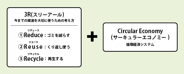資源を大切に使うための考え方として「3R(リデュース、リユース、リサイクル)」が知られていますが、CEは資源を効率的に循環させ、持続可能な社会をつくるとともに経済的な成長もめざす「経済システム」を意味します。